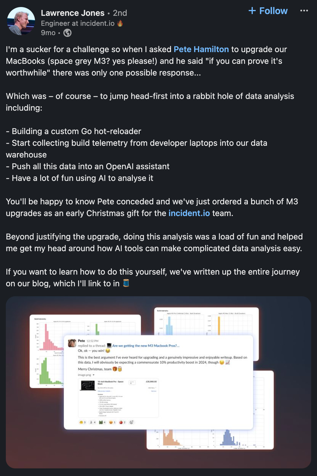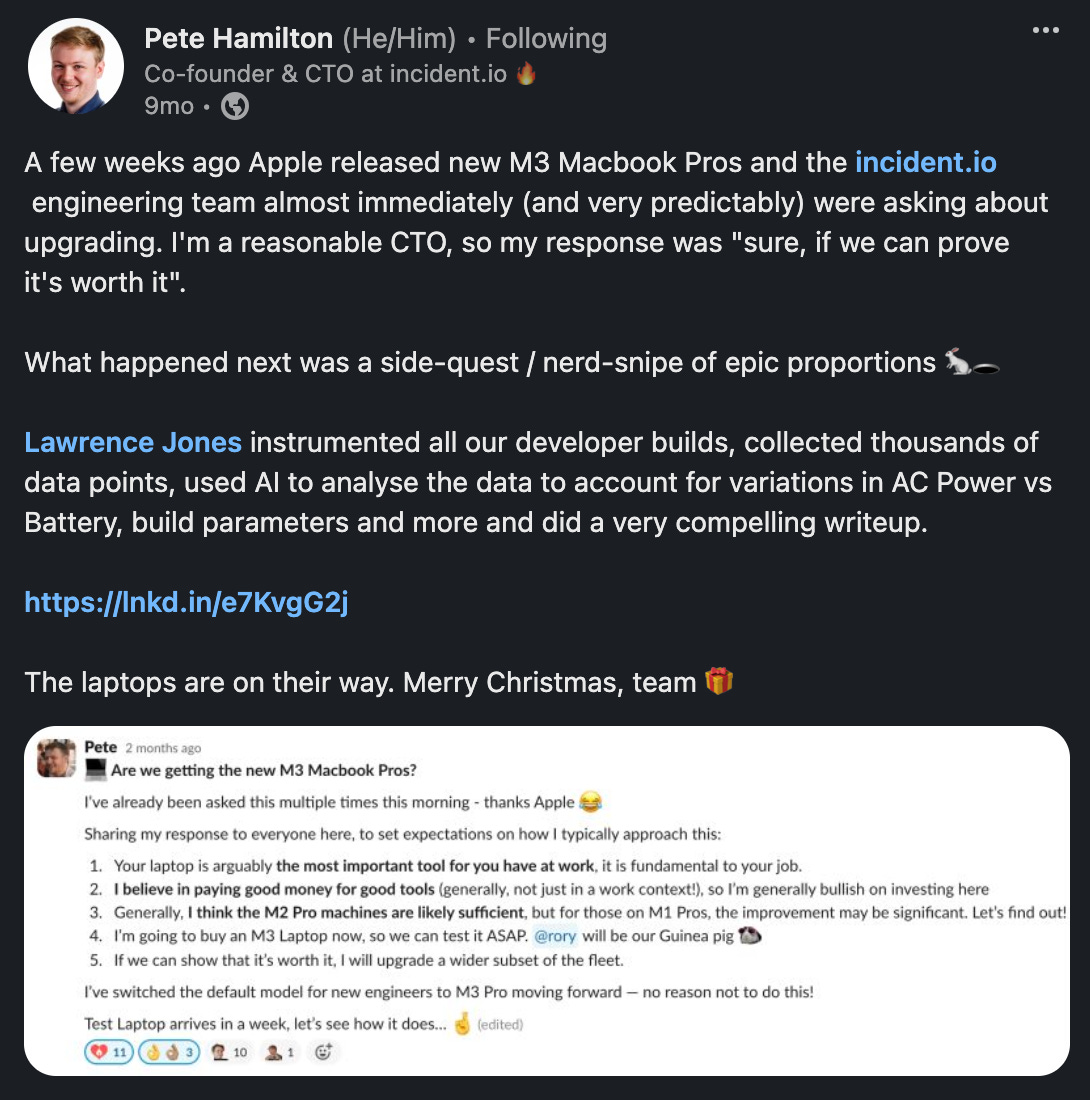 A great example that I witnessed over on LinkedIn a number of months ago, was a post from incident.io’s CTO Pete Hamilton regarding a request from his engineers to get new M3 MacBook Pros. This was evidently a potentially costly investment for the business, but Pete’s response simply wasn’t a straight-up “no”. To quote the guy directly “what happened next was a side-quest / nerd-snipe of epic proportions”.